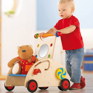 Although they’ll have to ‘grow’ into it, the Discovery Wagon from Haba is a beautiful push-along toy from Haba.